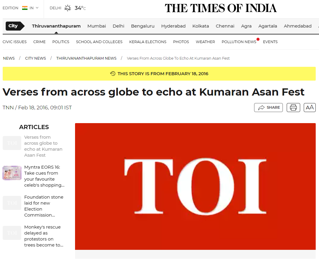 “Verses from across globe to echo at Kumaran Asan Fest”